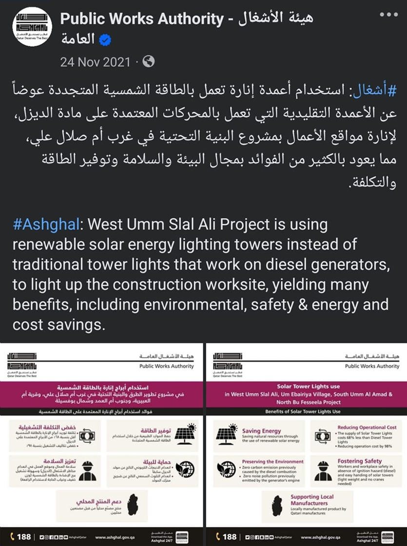 The initiative involves installing solar tower lights on site and site-offices replacing diesel generators on construction sites, which positively impacted cost saving, carbon footprint reduction, energy efficiency and safety.