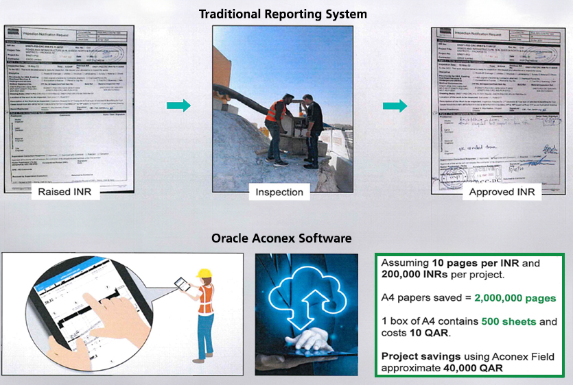 Aconex Field is reducing the use of paper, printer ink, and the generation of paper waste. By utilizing Aconex Field, contractors and consultants can create, receive, and respond to reports digitally on a single interconnected platform. In terms of sustainability, the carbon footprint of one A4 sheet of paper ranges from 4.29 to 4.79 g CO2-eq. Therefore, implementing Aconex Field eliminates the need for 2,000,000 pages over a 5-year project duration, resulting in a reduction of carbon emissions ranging from 8,580 to 9,580 kg CO2-eq. This approach also eliminates the purchase of 2,000,000 paper sheets approximate 40,000QAR., thereby reducing carbon emissions associated with the paper supply chain and cutting of reporting time by 60%.